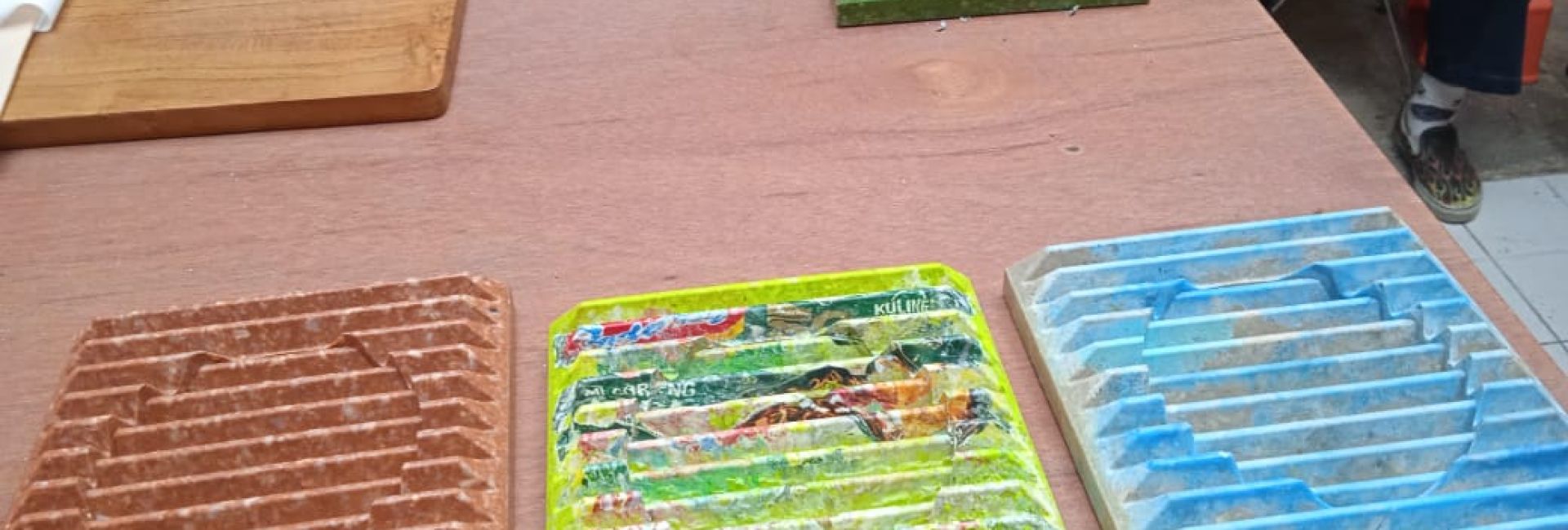 Salah satu aplikasi sederhana dari biopolimer itu adalah coaster, produk multiguna: bisa menjadi alas gelas, asbak, pen holder, atau jika rusak bisa diolah lagi untuk menjadi produk lain.